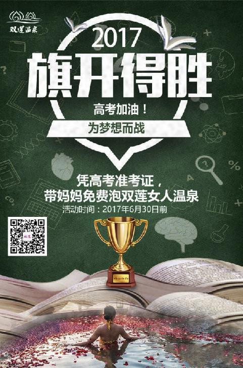 双莲女人温泉——最美化妆间 美容养颜、融合古法烹饪的养生花宴 此次“非凡宠爱之旅”来临之际,双莲女人温泉“旗开得胜,陪考妈妈免费泡”活动已率先火热展开。有一群人数年如一日辛勤付出,只愿你的人生步步登高;有一群人用他们的爱为你撑起一片天空,只愿你能够自在翱翔,他们就是父母。双莲女人温泉为回馈广大高考陪考家长,特推出“旗开得胜,陪考妈妈免费泡”活动:凭应届高考准考证,考生妈妈与孩子一同出行可享受免费泡汤。具体详情请咨询官方微信:双莲女人温泉。
