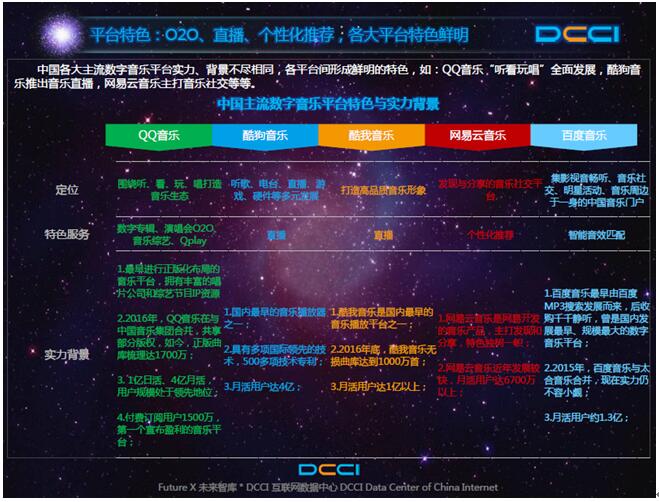 自2016年提出将会在“听、看、玩、唱”四个维度进行全方面的用户体验提升、以开启全新音乐生态后,QQ音乐已通过以用户为核心的全浸入式、生活化、社交化音乐理念,在一年多的时间内,实现了引领行业的新音乐价值打造。 近期, DCCI 互联网数据中心发布了“2016-2017年中国数字音乐平台价值研究报告”,对目前数字音乐平台的平台策略、市场格局、平台特色、版权资源、盈利模式等进行了综合盘点。报告指出:中国各大主流数字音乐平台实力、背景不尽相同,QQ音乐“听看玩唱”全面发展战略与酷狗音乐推出音乐直播,网易云音乐主打音乐社交等,具有鲜明的平台特色。