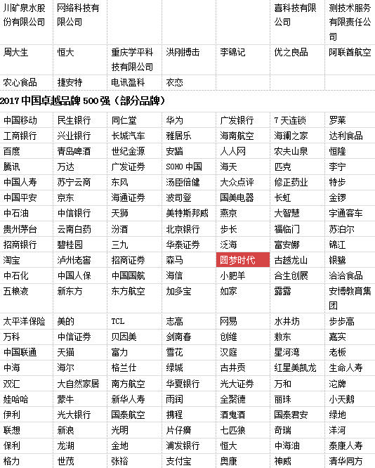 2017亚洲影响力品牌500强(部分品牌)
