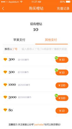 2.通过推荐用户充值时填写自己的丫号为推荐人赚取小券。 当用户通过第三方充值时填写了您的丫号作为推荐人后,系统会将该用户充值金额的5%折算成小券,以推荐人奖励的形式打到您的小券账户上; 充值过程: