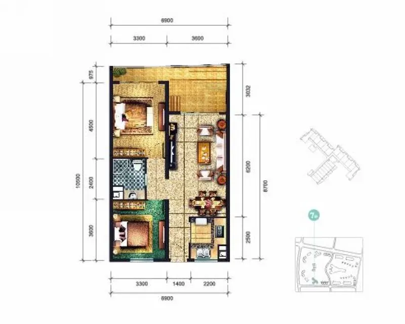 户型图 7#221室为两室两厅一卫的方正户型,满足一家三口的居住需求。户型设计有朝东的两个阳台,主卧和客厅纵享热带园林景观,也可按照需求做特别的设计改造。小区户型均通透,享文昌万亩原始椰林生态气息,徒步走出小区东面即是高隆湾海域,高隆湾拥有大面积沙滩,度假养生增添乐趣。
