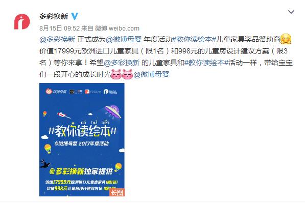 8月11日,新浪微博母婴、一直播、红豆live联合发起#教你读绘本#大型活动,新浪微博红人大V领读,权威专家指导帮助宝爸、宝妈在21天内学会正确的亲子阅读方式,多彩换新为此次活动赞助了价值17999元的欧洲原装进口儿童家具一套,和价值998元的儿童房建议设计方案三套,与新浪微博、一直播、红豆Live一起传播正确的亲子阅读方式。