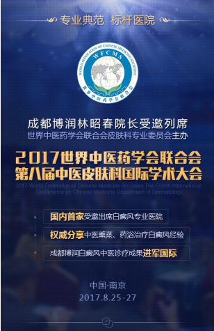 2017年8月25—27日,中国江苏省南京市即将召开“世界中医药学会联合会第八届中医皮肤科国际学术大会和2017中国中医药研究促进会皮肤性病学分会学术会议”。此次大会为了促进皮肤科的发展,交流中医、中西医结合皮肤科疑难病症的诊治新技术、新进展,特邀成都博润白癜风医院林昭春院长就白癜风中医药诊疗的发展,进行学术报告,成都博润荣幸成为国内首次获邀的唯一一家白癜风专业医院。