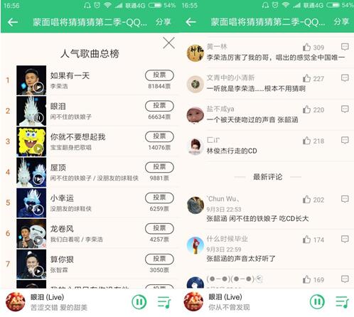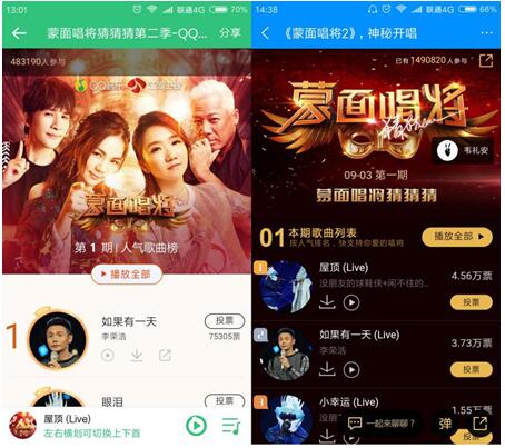 说到首期节目最具话题性的,非声音与林俊杰高度相似的“球鞋侠”莫属,由于声音太过“迷惑性”,除了现场观众的热情竞猜,在酷狗唱唱APP“蒙面唱将独家线索抢先猜”栏目也掀起了一股全民竞猜热潮。而这位“没有朋友的球鞋侠”和“闲不住的铁娘子”合唱的一首《屋顶》也迅速在酷狗音乐《蒙面唱将猜猜猜》第一期歌曲人气排行占据第一名。另外,凭借对梁静茹的《如果有一天》的成功演绎,成功揭面的李荣浩火速占据了QQ音乐“蒙面唱将”人气歌曲榜第一期的位置,在歌曲评论和弹幕中,对于尚未摘下面具的蒙面歌手的身份的讨论也是甚嚣尘上。