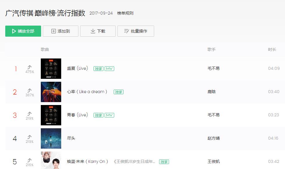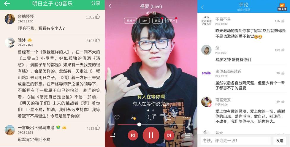 对于选手们精彩绝伦的表现,网友们纷纷通过QQ音乐、酷狗音乐、酷我音乐应援打气,999+热评歌曲不断涌现,热评点赞数更是动辄破万。最终,在人气值比拼中,毛不易以微弱优势打败马伯骞,众望所归赢得《明日之子》最强厂牌殊荣,获得白金唱片,夺冠曲《盛夏》更是力压鹿晗和王俊凯、蹿上QQ音乐巅峰榜流行指数榜首。从盛夏到初秋,在《明日之子》的未来偶像孵化过程中,腾讯音乐娱乐也充分玩转“听看唱玩”的“鹅式综艺精神”,为粉丝们打造极具凝聚力的立体参与感。