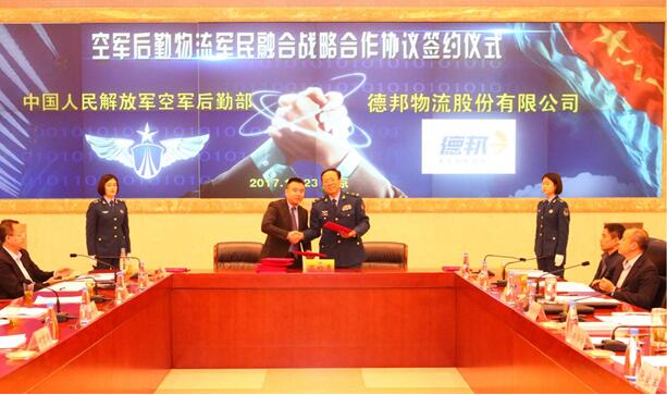 10月23日,空军后勤物流军民融合战略合作协议签约会议在北京召开,会议上,德邦正式与空军后勤部签署战略合作协议,承接部队的部分物流服务,全面参与到军民融合这一国家大战略的落地实施。空军后勤部部长郑学祥、政委张家军、副部长姚焕忠以及德邦物流股份有限公司轮值CEO韩永彦出席了本次签约仪式。