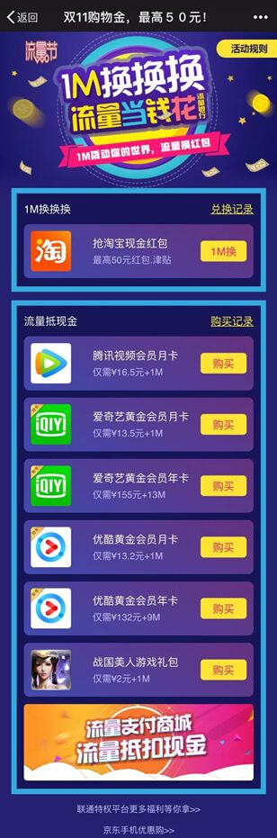 根据这张活动详情页得知,中国联通推出几个活动,比如联通手机用户可以用1M的流量兑换淘宝礼包等产品。可以感觉到,这次流量节真是下了真功夫的。据了解,这几个产品都是非常强势的产品。比如说最高50元淘宝现金礼包,在双11购物节来临之际,对于很多“剁手党”而言,简直是雪中送炭、久旱逢甘霖。据了解,这是中国联通和阿里在双十一前联合开展的最大让利活动,也是中国联通首次开放流量兑换能力。 此外还有各大视频网站会员的抵扣券,分别抵扣1元到11元不等。对于像我这样观看《军师联盟》《海贼王》《鬼吹灯》等视频的用户来说,会员简直是刚需的精神食粮啊。 其实本次活动中国联通只是想告诉用户“流量可以当现金”这个概念,这几天下血本估计也是想试试用户对接受程度,如果效果不错,我相信,以后联通用户的剩余流量,就可以直接当成现金去购买各种商品和服务了。 对于这样挥霍剩余流量的日子,小编还是满心期待的。 |