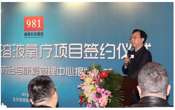 白书忠部长发表讲话 赵伟董事长表示:“981专心肿瘤防治工作有七八年时间,我和陈义勤部长、王文中局长、王晓钟院长前后4次前往欧洲Barco诊所,了解OPL氧疗技术,在那里,接受治疗的胰腺癌病人能健康存活9年以上,我们力争把OPL技术完全落实中国,为肿瘤病人的康复和延长生存时间做贡献。” “很欣慰与981合作,我愿与981一起为肿瘤逆转治愈作斗争。”国际氧疗协会主席Barco在会上表示。据了解,OPL多原子溶液氧疗技术依据诺贝尔奖“人体细胞需要进行电子交换,而当人体的细胞缺氧就会致癌”理论,由意大利医学博士Giovanni Barco潜心研究长达25年创立,是普及肿瘤人群(尤其对胰腺癌、脑胶质瘤、前列腺癌、乳腺癌、大肠癌、膀胱腺癌、肺癌等十余种癌症)、慢性炎症人群、呼吸系统疾病人群以及驻颜抗衰人群的前沿医学技术。目前,接受治疗的全球患者已逾25万例, 包括英国女王、利比亚前总统卡扎菲、多位意大利足球明星,被誉为21世纪医疗重大突破。 会上,北京星牌集团董事长甘连舫说道:“981引进OPL氧疗技术举措响应了全国人民代表大会的号召,981是国寿星牌转型大健康很好的合作伙伴。”北戴河新区管委会副主任王占胜指出:“981引进OPL多原子溶液氧疗项目,是实现健康中国梦的重要举措。”最后,中央军委保健局原局长981健康医学中心CEO王文中强调:“新型氧疗OPL由传统吸入到液态输入的转化,是肿瘤治疗的重大进步,OPL氧疗技术荣获欧盟九项认证,对肿瘤等疾病有很好改善效果,在981接受OPL义诊的患者,纷纷表示OPL技术安全有效。”