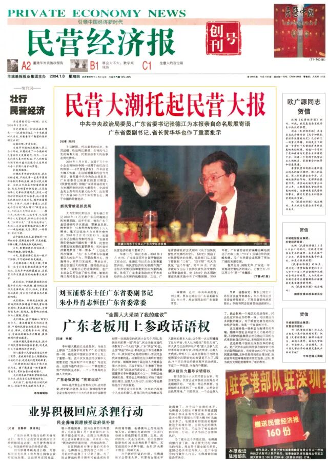 图为创刊号 踔厉风发,星流霆击。创刊前夕,时任中央政治局委员、广东省委书记张德江为《民营经济报》题词,寄予厚望:一定要办好《民营经济报》,使之成为宣传党的方针政策的阵地,民营企业信息交流的平台,民营企业家学习的良师益友。 ![]() 磨砺以须,得时无怠。2004年1月8日,一份立足于民营经济的分众媒体《民营经济报》,秉“让市场了解民企,让民企把握市场”之理念,在南中国横空出世。 创刊号特刊《民营中国——中国民营经济白皮书》,以对开100版的恢弘气势,全面回顾了中国民营经济柳暗花明的发展路径,高屋建瓴地解读了民营经济大潮的风云变幻。 ![]() 发刊词《壮行民营经济》,直言《民营经济报》的办报宗旨与经营方向,璧坐玑驰;头条文章《民营大潮托起民营大报》,阐释了报纸创办的背景与前景,笔酣墨饱;专题策划《广东民营企业现状调查》,剖析民企发展现状,波澜老成。 创刊如穿云响箭,新生即振鳞奋翼。不到一年,《民营经济报》就祖述有自,取得了跨越式的大发展:打响了报纸品牌,最高发行量达20万份;冲破了区域局限,在北京、东北、华中、西南、西北等地设立多个新闻中心;探索了“低投入、低风险、高产出”的办报之路,社会效益、经济效益开始双丰收。 斩将搴旗,我武惟扬。张德江再寄望:一定要办好《民营经济报》,一定要立足广东,面向全国,这样市场才会更加广阔,《民营经济报》就是一份面向全国的报纸,是“中国民营经济报”! 我们珍视《民营经济报》,是因为它始终坚守“民营推动中国”的办报宗旨,江河行地,如日方升。 从《粤港信息日报》对社会领域的公共关怀,到《民营经济报》对具体经济形态的专业观察,这份媒体前世与今生的新闻运作方式,也从狂飙突进转向了深耕细作。 诚如斯言,实行社会主义市场经济,必须扶持民营企业——民营企业是市场经济的基本细胞,民营企业家是市场经济活动的重要参加者。民营经济是稳定经济的重要基础,是国家税收的重要来源,是技术创新的重要主体,是金融发展的重要依托,是经济持续健康发展的重要力量……民营推动中国,兹事体大!