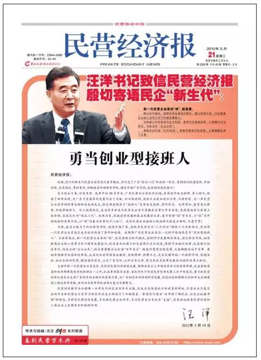 同声相应,吴越同舟。《民营经济报》决定挺身而出,全文发表民企“创业二代”给省委书记的信——《勇担加快转型升级建设幸福广东重任》,为民企加油,给“创业二代”鼓劲。3月12日,刊有此信的《民营经济报》,由参会报道记者送给了正在北京出席全国两会的时任中央政治局委员、广东省委书记汪洋。