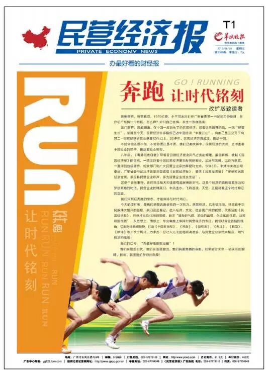 引而申之,补苴调胹。围绕“创业二代”,《民营经济报》又连续召开了大型专题研讨会,推出了一系列新闻述评,激发民企精神,汇聚民企能量,助推民企升级……一时之间,《民营经济报》秀出班行,声名远播。 民营经济报人笃信,为民营企业家代言,就是在播种诗和远方…… 我们珍视《民营经济报》,是因为它曾经直面困局,一跃而起,在新的起跑线上厌难折冲。 朝升暮合,困知勉行。随着行业蓝海消失,红海泛起,《民营经济报》也难免倒悬之急。这一次,《民营经济报》借助企业力量,希望藉此拔丁抽楔,弘济时艰。 ![]() 浮图七级,重在合尖。2012年6月8日,《民营经济报》调整了奔跑的姿态,全新改版再出发。 这一天,《民营经济报》以122版的总量冲击广州媒体市场,云集景从;这一天,《民营经济报》附有纪念金币,引发抢购,蔚为壮观;这一天,《民营经济报》调整发行策略,在全广州的报摊全面铺开,风樯阵马……