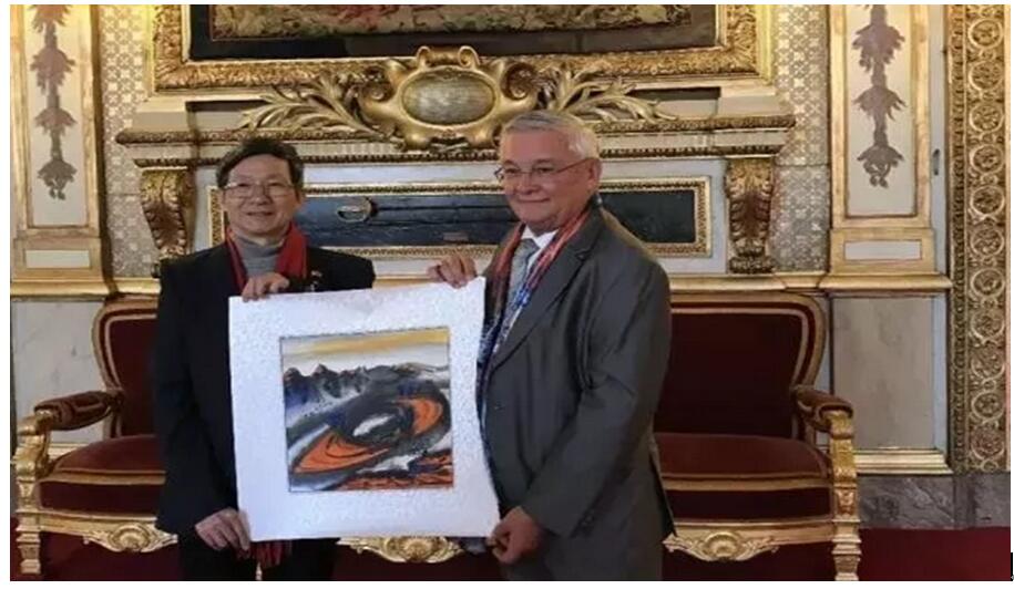法国东方文化艺术协会名誉主席黄建南为国礼画家杨弘岳作品题款