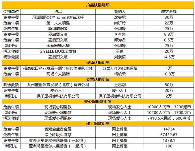 (巫启贤身穿爱心手绘队服) 随着香港著名主持人拥有港澳台地区首位获得国家注册拍卖师资格的职业拍卖师许莹与联合发起人黄江完美的配合使得现场气氛不断被推向高潮。拍卖晚宴上一共展示了5件拍品,各具不凡,夺人眼球。其中:冯珊珊、梁文冲签名的HONMA球杆2支,拍出30万元,捐向中国福利基金会免费午餐基金;第一夫人项链,拍出22万元,捐向中国福利基金会免费午餐基金;斯坦威钢琴,拍出25万元,捐向中国福利基金会免费午餐基金;金丝楠木椅拍出25万元,捐向北京新阳光慈善基金会;Giselle liu珠宝捐赠的发簪拍出20万元,捐向中国扶贫基金会明珠慈善基金。 著名歌星巫启贤助力慈善倾情义演,共募得23.8万元,其中9.3万捐向中国福利基金会免费午餐基金,14.5万捐向中国扶贫基金会明珠慈善基金,巫启贤的义演的感染到了一位爱心人士现场捐出20万元,该笔善款捐向中国福利基金会免费午餐基金。 此外,拍卖会现场还引发了不少爱心人士与爱心企业的热情,中国福利基金会免费午餐基金秘书长苏哲芳女士代表招商蛇口产业发展一周年庆典简单队全体,现场捐出1万;明星代表、知名音乐制作人杨峻荣现场捐出10.8万,这两笔善款都会捐向中国福利基金会免费午餐基金。与此同时,爱心企业也不忘鼎力支持;九州盛世体育发展(北京)有限公司,捐出80万,这笔善款全部捐向中国扶贫基金会明珠慈善基金。保千里视像科技有限公司,捐出2万,这笔善款会捐向北京新阳光慈善基金会。 除去线下的现场拍卖,线上也有相关的捐款渠道,截止发稿时间为止,本次赛事的战略合作爱心企业香港金盛贵金属,已募集到14,734元,爱心企业绿色呼吸牛蒡茶,已募集到57432.67元,最终这些爱心款项将会捐赠给中国福利基金会免费午餐基金。