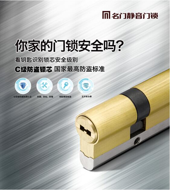 怎样才能抵挡住小偷的攻击,这得看锁芯的防技术开启时间。根据我国关于锁芯的国家标准,A级锁以技术开启超过1分钟为合格标准。B级锁,以技术开启超过5分钟为合格标准。而C级锁芯,则以防技术开启时间10分钟为标准。 从这个角度来说,选择超B级或者C级门锁,才能给你满满的安全感。年末将至,又是小偷异常活跃的时段,有空不妨去附近的名门静音门锁体验馆转一转,换一把C级防盗门锁。 风格|找不到命中注定的那一把锁 随着一批批85后、90后相继成为房子的主人,他们对一件事越发忧愁,衣服有韩风、欧美风、通勤风、嘻哈风、洛丽塔风、淑女风的他们,为什么会选不出一把自己喜欢的门锁? 市面上,很多品牌的门锁都不太关注设计,基本上是互相抄袭爆款,或者随便找个款式改一改就上市了。很少门锁品牌会花大价钱去找名师合作,主推原创款式。