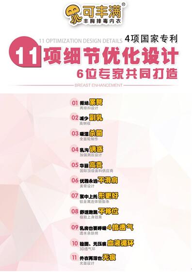可丰满锗能量丰胸内衣为什么能够登上“镇店之宝”的宝座?原因在于其与一般的内衣大有不同。可丰满锗能量丰胸保健内衣运用了进口金属锗,这4颗锥形面锗石分别对应按摩胸部相关穴位,达到中医穴位的按摩功效,4个中医穴位,24小时刺激胸腺能达到细胞的二次发育,直接促进胸部组织运动加快细胞的新陈代谢,激活胸腺细胞的活跃性,从而使细胞增多、膨胀、紧致、从而达到丰胸美乳的效果。 可丰满锗能量丰胸内衣是一件解决客户实际困扰的产品。虽然你穿了很多年内衣、文胸,但是你的内衣上身穿着舒服吗?有没有丰胸效果?有没有解决你的一些难言之隐?可丰满为用户所想,成就女人大胸梦想,呵护女性健康,让女性远离乳腺疾病。