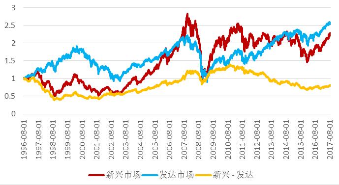 图表 1:8月市场动荡中新兴市场不断上扬 来源: MSCI, Wind, 歌斐资产创新研究部 这种运动模式可以说相当罕见。多年来大家已经习惯的市场规律是(如下图所示),在风险事件冲击中,新兴市场回撤幅度总是要比发达市场大得多,并且恢复少,最终结果是不断跑输发达市场。