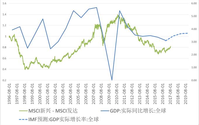 图表 8:新兴与发达市场股票走势存在强弱周期转换 来源:MSCI,Wind, 歌斐资产创新研究部 在强势周期中,新兴市场能收获丰厚的相对收益。我们从三个方面简单阐述新兴市场相对收益的来源。 •相对收益来源一:全球增长 全球经济景气度是新兴市场相对收益的首要来源。下图我们可以看到,新兴市场相对收益曲线与全球GDP增速高度相关,连短期波折都一一咬合。这是因为在全球的景气阶段,新兴市场受益更多,收获更高的弹性。当前,全球增长正处在7年下行后的触底反弹阶段,2017年全球复苏的证据越来越多,世界银行,IMF以及各类评级机构已数次上调全球增长预期。我们看到相对收益曲线也已经筑底。