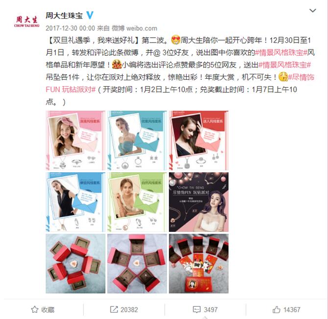 据悉,本次微博活动是继第一波好礼活动得到网友们的广泛参与和支持后的新动作,意在新年的伊始给长期支持周大生珠宝的朋友们送去新年礼物与祝福。截止目前,周大生第二波微博活动博文累积转发量已达20000余次,评论及点赞数分别达到了3000余次和14000余次,其中更有一些微博大V及时尚红人转发助阵,不得不说周大生的第二波微博活动再次吸引了大量的眼球。 早在11月23号的时候,周大生就已经凭借第一波微博活动吸引了众多的视线。周大生珠宝的官方微博当天发起了“风格体”活动,依据《急诊科医生》中的徐然和张泠的角色特点写出了风格例句,让广大网友参考格式造句,分享属于自己的风格体,同时也送上周大生所准备的精美礼物。