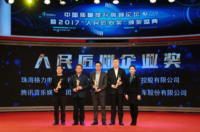 在论坛的最后,人民网颁发了2017“人民匠心奖”。经过严格筛选和评审,最终腾讯音乐娱乐集团、珠海格力电器股份有限公司等4个企业荣获“人民匠心企业奖”。