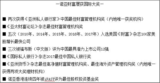 此次评选,是《亚洲私人银行家》杂志连续第7年为亚太地区的私人银行颁发年度奖项,这一评选也已成为亚太区私人银行业界最权威、最重量级的奖项之一。诺亚控股2016年首次参与评奖,即摘取“中国最佳财富管理机构”桂冠,2017年再次蝉联。 2017年的评选标准较2016年又有升级,从管理资产、业绩表现、产品平台、人力资源和客户体验5个方面对参选私人银行进行综合评定,并由专业的评选委员会确定每个奖项的唯一得主。 截至2017年三季度末,诺亚控股累计金融产品募集量达到4,700亿人民币,同比增长32%;旗下歌斐资产的资产管理规模达到1,429亿人民币,同比增长24%,其中海外资产管理规模达到30亿美元。 除了继续提供多元化的金融资产配置和综合金融服务外,2017年诺亚控股的海外业务拓展也硕果累累,美国纽约、加拿大温哥华、澳大利亚墨尔本的办公室相继开业,并顺利取得美国注册投资顾问(RIA)和保险代理人执照。 同时,诺亚控股在2017全年持续致力于投资者教育活动的开展,全年召开了十多场千人以上的大型峰会,并邀请到凯雷投资创始人大卫·鲁宾斯坦David Rubenstein, 橡树资本联合创始人霍华德·马克斯Howard Marks等全球资产管理业界翘楚来为客户分享他们的投资理念。在诺亚控股上市七周年之际,霍华德·马克斯应邀成为“诺亚大学”客席教授,将进一步为客户提供更多除财富以外的附加价值。