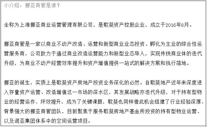 其中,挪亚商管将蓄势待发,充分发挥其资源整合的能力及文创科创双创领域的核心优势,全力支持集团平台建设及歌斐资产持有型物业的迭代升级,树立行业内的运营标杆。 |