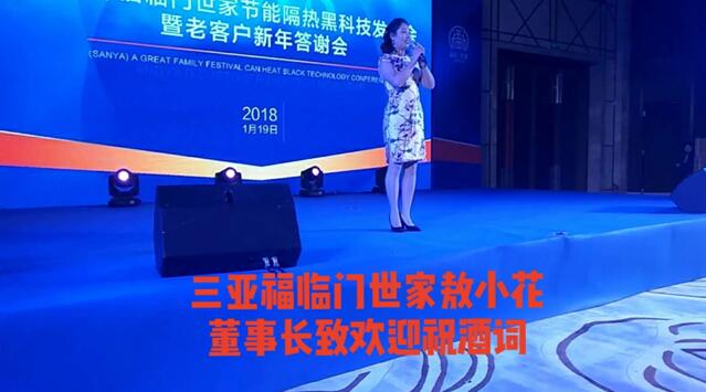 三亚福临门世家节能隔热黑科技发布会现场 发布会上广东福临门世家梁晓东董事长就企业发展规划进行了说明。发布会结束后开始了三亚福临门世家的新年答谢欢迎晚宴。敖小花董事长举杯祝愿各位新老朋友新春快乐!合家幸福!