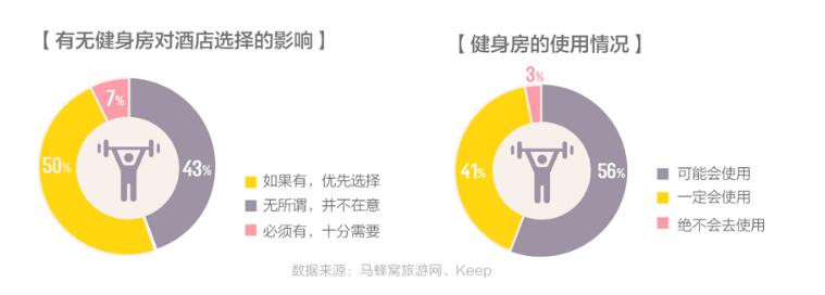 旅途中坚持运动的人中,有一半的人会优先考虑带有健身房的酒店,但其中只有 41% 的人真的会去使用。总体来看,人们会缩短运动时间,56% 的人运动时长不足 30 分钟,39% 则会运动 30 至 60 分钟之间,只有 4% 的人能运动一个小时以上。从这些目标与执行之间的偏差可以看出,旅途中坚持运动很容易沦为空喊的口号。