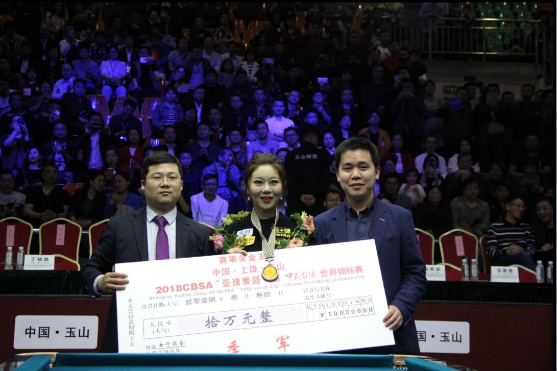 与会领导还为本届赛事的冠亚季军颁奖,亚琦集团副董事长廖桂林为女子组冠军韩雨颁发40万元奖金,何泽华项目总经理为女子季军球员韩国小魔女金佳映颁发了奖金和证书。
