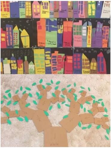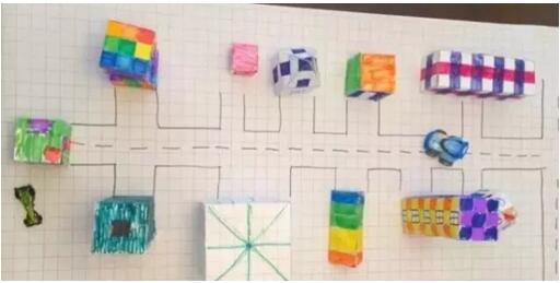 ○ 分数与参天大树 美国孩童从二年级开始,就要接触分数的概念。老师会让他们用硬纸板做一个“分数树”,直观地理解整体(whole)和部分(part)的关系。树干是整体1,树枝分成1/2, 再分成1/4, 1/8 和1/16,最后点缀上绿叶。一棵独具创意的“分数树”就完成了。 ○ 圆的等分和圆规画 美国学生从七年级开始学习使用圆规,其中“如何用圆规将圆形等分”是重要的一节。 美国老师创造出了这样的美术作品:首先,用圆规将圆形等分成12份;然后,在大圆的边缘上,画出相并的小圆圈,在大圆的中心画同样大小的小圆;最后涂上颜色,给人以3D的视觉感受。 ○ 3D 和城市 美国孩童从一年级开始要学习区分平面图形和立体图形。在立体图形的学习中,他们不仅要辨识各种形状的名称,还要了解各个形状的特点。如有几个棱,几个面和几个角?这对于熟悉了“平面图形”的小朋友来说,立体图形的特点往往难以掌握。这时,数学老师就会带领孩童采用折纸的方式,将平面图形折出空间立体形状。 为配合教学,老师还会在教室贴出这样的海报,学生们看着眼前的3D形状,将每个形状的特点一一对应。接下来,学生们还会用这些立体形状搭建一座城市,这座城市的名字叫做“面积与周长之城”,因为他们还要计算出每座楼的面积与周长。