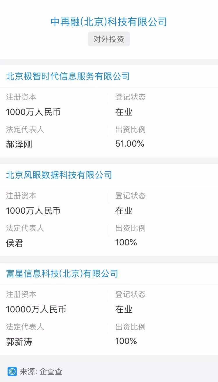 整体看来,此次中再融科技收购财富星球,无外乎以下三种情况:抱团取暖谋求发展、顺应监管合规要求,以及为集团化运作做好前期准备。 与此同时,P2P评论通过第三方数据服务平台——“企查查”查询发现,中再融科技对外投资的项目包括:北京风眼数据科技有限公司、富星信息科技(北京)有限公司、北京极智时代信息服务有限公司,共3家企业。 也就是说,此次收购的终极目标,或将落脚于集团化运作这条路径上。 集团化运作进入2.0时代 集团化运作,一方面是互金行业进化到成熟阶段的一种具体表现,另一方面正成为行业发展的一种重要趋势。 事实上,早在几年前行业就出现过一轮平台扎堆集团化,然而与现阶段不同的是,此前平台集团化的核心多来源于商业本质:切入更多场景、获取更多细分人群、打造更多新业务、甚至跨领域进行合作等等,其目的更指向做大体量。 随着近年来监管政策的持续推行和各个平台积极推进合规建设,行业已循序进入到良性的市场竞争当中,此时考虑集团化运作,不仅有可能满足监管合规需求,同时也可以降低运维成本,和提高研发、风控等方面的效率。 换言之,集团化运作或将凭借更全面、更高效的金融服务方案,成为互金行业最终突围和胜出的“基础条件”。 从目前的布局来看,中再融科技已是一家旗下拥有北京风眼数据科技有限公司、富星信息科技(北京)有限公司、北京极智时代信息服务有限公司三个独立品牌的小型金融科技平台矩阵,这也为其未来集团化运作奠定了一定程度的业务基础。 除自建集团生态之外,始终深耕“绿色金融”领域的中再融,还在不断加强生态外建设,带动再生资源产业价值链的重构。 特别是去年12月,由中再生协会牵头,中再融联合中民国信、招商证券、国开证券等金融机构共同发起成立中再生协会绿色金融服务中心,通过资源整合和服务联动,积极推动行业内金融机构集群发展。中再融作为绿色金融服务中心运营主体,承担中心整体战略发展的所有运营工作。 今年4月,作为中再生协会绿色金融服务中心运营方,中再融与河北瀛源集团达成战略合作,正式牵手北方循环经济示范园,为园区再生资源企业解决融资问题。