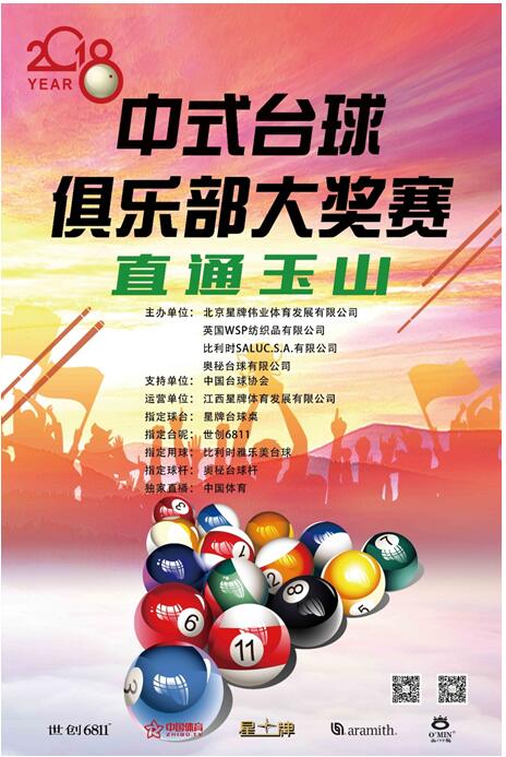 本次比赛的指定球桌为星牌台球桌,指定用球为比利时雅乐美台球,世创6811为比赛指定台呢,奥秘台球杆为比赛指定球杆。欢迎广大台球爱好者踊跃报名,报名截止时间为每站比赛开赛前一天。报名地点为各比赛承办俱乐部,各俱乐部名单详见星牌官方微信。中国体育将作为赛事唯一视频播出平台,全程倾力直播各场比赛精彩对决!本次活动解释权归中式台球俱乐部大奖赛赛事组委会所有! |