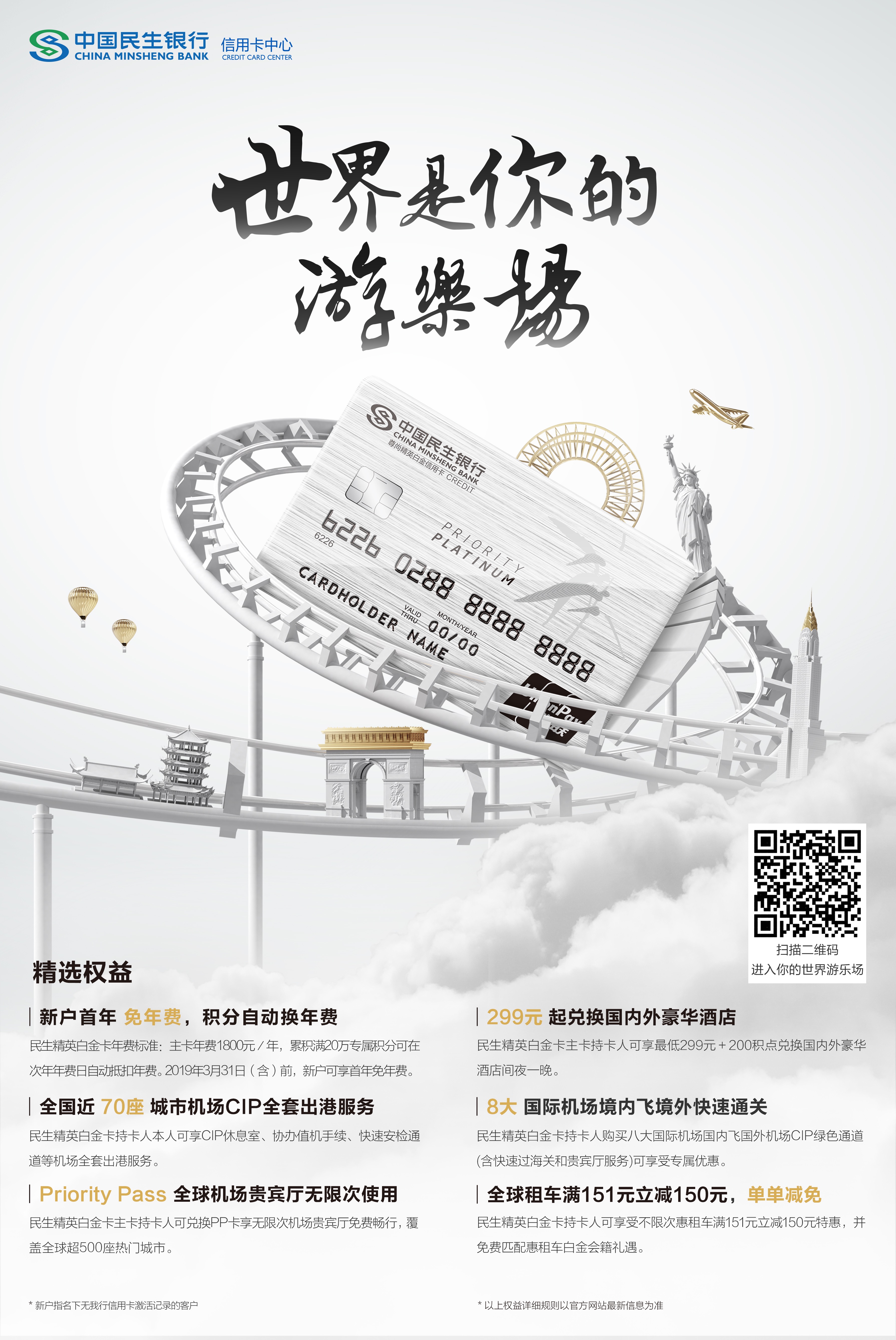 —民生信用卡为尊贵的您提供全场景出行服务 "世界那么大,我想去看看",三年前的一张史上最浪漫辞职书之所以风靡社交网络,是因为短短一句话,道出了都市职场人的心声。今天,身处钢筋水泥快节奏生活里的职场人们,依然想要走遍世界看看更远的风景,也想要多陪伴家人创造更多幸福时刻。我们每一天都在尽力扮演好每一个社会角色,但是,那个内心中最真实的自我却已慢慢模糊。 其实每个年龄层都会有自己不同的困境,最关键的是如何去面对。民生银行新推出的精英白金卡给了我们一次找回初心、做回真我的机会。 2018年3月,中国民生银行信用卡中心为精英商务人群量身定制了一款全新的商旅出行信用卡——民生精英白金信用卡。该卡是民生信用卡众多产品里比较特殊的一款产品,它瞄准的是职场中的年轻精英人士,深度挖掘其“工作越久,能力越强,压力越大”的痛点,以“让世界成为你的游乐场”为主题进行产品权益设计,涵盖酒店、境外消费、世界景点、旅游保险等多方面优惠权益,呼吁人们找回初心、做回真我。民生精英白金信用卡不仅可以陪伴我们看遍世界,更能够大大提升出行体验。 第一,这是一张真正可以免年费的卡:新户首年免年费,次年积分自动换年费;第二,出行权益众多:包含Priority Pass全球机场贵宾厅无限次使用、全国近70座城市机场CIP全套出港服务、单次最高2000元航班延误险(延误两小时起赔)、8大国际机场境内飞境外快速通关(VISA提供)等;第三,轻松入住国内外豪华酒店:299元起+200积点兑换国内外豪华酒店;第四,出境保险租车特惠:全球租车满151元立减150元,单单减免(美国运通提供),出境保险5折超值优惠(美国运通提供);第五,世界著名博物馆、国家公园返现权益等等。*以上权益详细规则以官方网站最新信息为准。 民生银行一直走在场景金融的前沿,此次推出的精英白金信用卡,更是通过极具优势的全场景服务内容,真正站在消费者的角度思考问题,体现了民生银行做“懂你的银行”这一品牌理念及“为民而生,与民共生”的企业使命。 下一刻,就让民生信用卡陪伴最真实的自己出发,让世界成为你的游乐场。