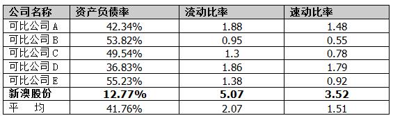 数据来源:WIND资讯 从上表不难看出,新澳股份的毛利率、净资产收益率等关键盈利指标明显优于行业平均水平,表明公司的盈利能力处于行业一流;期间费用率在可比公司中最低,表明新澳股份在成本费用控制方面做得非常好,体现了公司高水平的管理能力。 值得一提的是,在上游原材料羊毛持续涨价的背景下,新澳股份依然能够保持较高的毛利率水平,一个重要原因是公司拥有近3000家优质客户,下游客户多是行业的佼佼者、知名品牌的拥有者。而这些中高端优质客户更加注重原材料的品质,这一点使得新澳股份能够长期保持高于行业平均水平的毛利率。 资产质量和偿债能力方面。新澳股份截至2016年12月31日的资产负债率为27.03%,截至2017年9月30日的资产负债率为12.77%,这样低的负债率,不仅在同行业上市公司中属于最低,就算在整个A股市场也处于非常低的水平;公司截至2017年9月30日的流动比率和动比率分别为5.07和3.52,大幅高于2.07和1.51的行业平均水平,说明公司的资产的流动性状况非常好,偿债能力极强。 表2: 新澳股份资产质量和偿债能力指标同行业对比(以2017年3季报为基础)