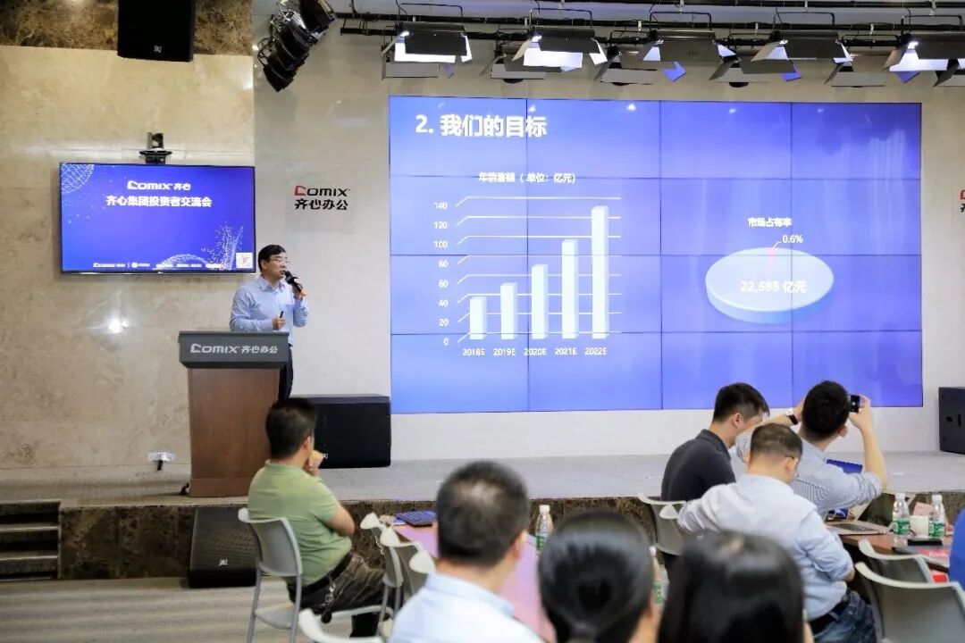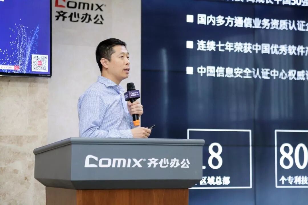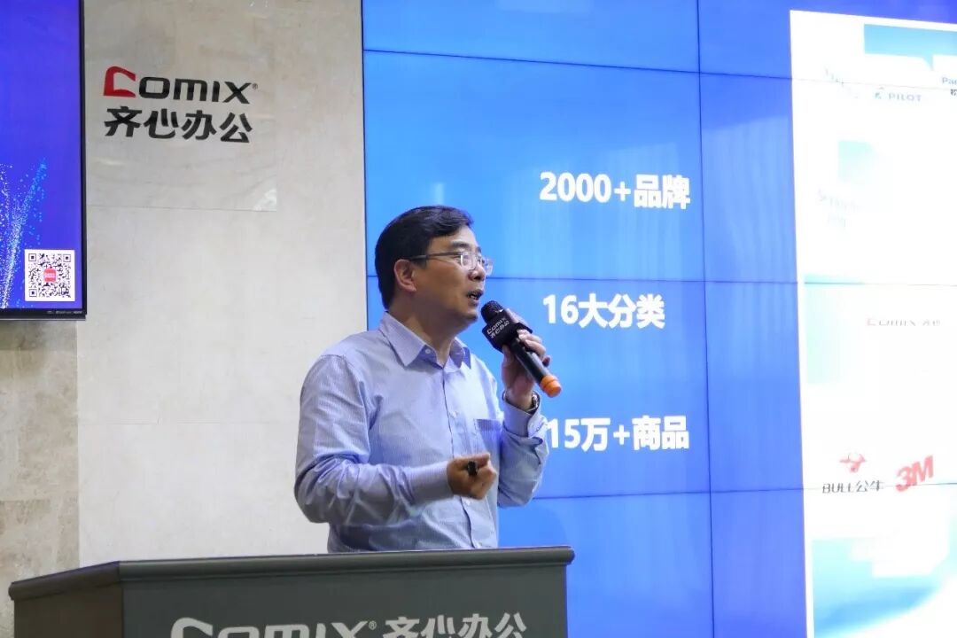 齐心集团董事兼高级副总裁戴盛杰先生 据戴盛杰介绍,齐心集团的核心业务主要有B2B办公物资(硬件业务,传统办公业务)和云视频业务(SAAS服务,现代办公服务)两块核心业务,随着行业移动化、智能化、平台化、社交化趋势的到来,企业级客户的需求一定是硬件+软件+服务的综合服务需求;根据券商研报,预计2022年,办公物资行业超2万亿规模,其中,近千家头部客户占50%市场份额。目前办公物资行业市场是高度碎片化的,还没有形成寡头,行业发展空间极大;齐心集团现有大型客户及中小客户过万家,中标的大型客户90家,90家中标客户年采购规模在300亿元以上;齐心集团B2B办公物资业务未来五年力争实现销售收入135亿,成为全国排名前二的专业垂直电商企业。