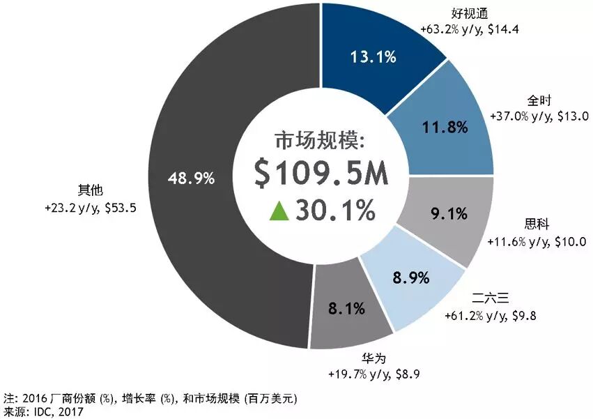 齐心集团副总裁侯刚先生 侯刚表示,银澎云计算是国内领先的云计算产品和服务提供商,隶属于齐心集团。公司目前的核心产品包括云视频会议SaaS产品、智能终端产品(包括大型、中型、小型会议室解决方案等)、行业定制产品(智慧党建、智慧教育等)三类,预计今年还将推出音视频开放平台暨PaaS产品。旗下的“齐心好视通”云视频产品广泛应用于远程会议,远程教育,远程培训,远程医疗,远程招聘,应急指挥等领域,目前服务超过60000客户。根据IDC报告,2017年公司云视频会议国内市场占比达13.9%,连续2年国内市场占有率第一。齐心好视通未来5年力争实现13亿元以上年收入,并在不断夯实现有云会议核心优势的基础上,大力发展智慧党建、智慧教育业务线。 齐心好视通连续两年在网络会议市场的市场份额第一 增长率第一