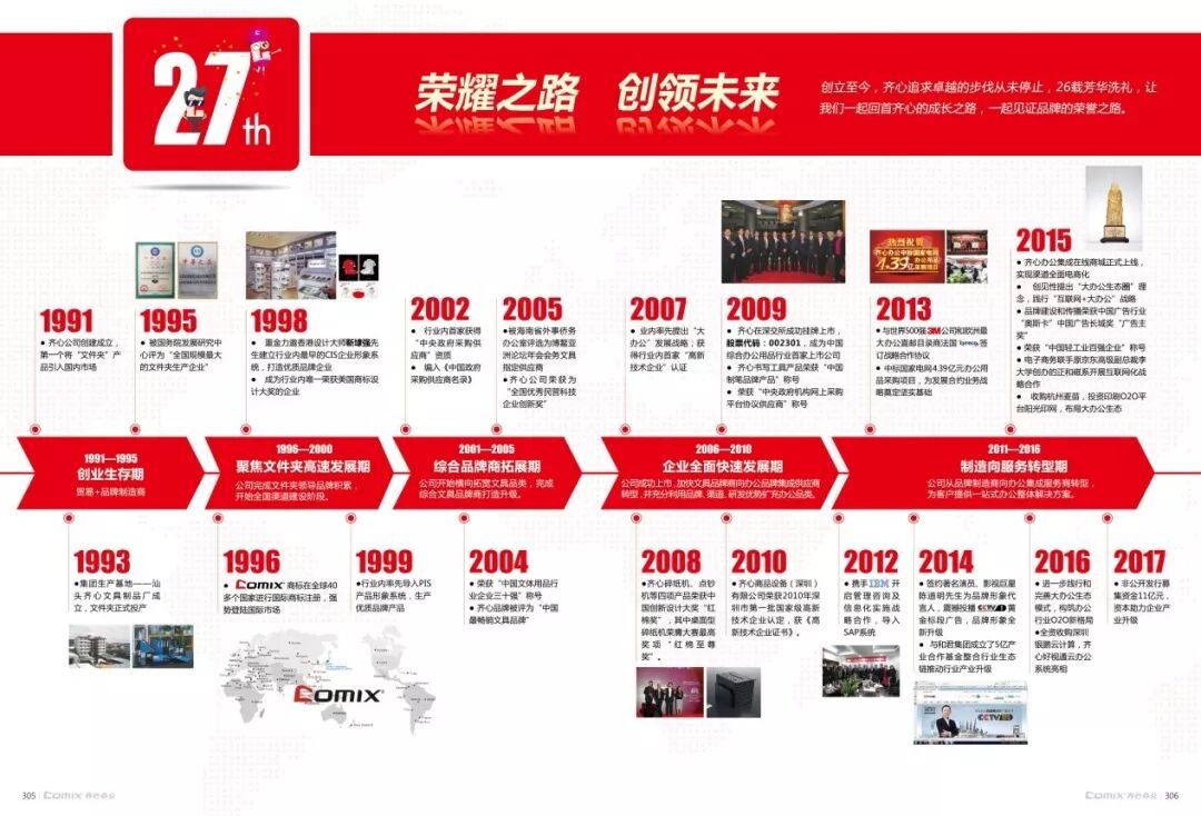 走进齐心,感受齐心的文化 改革开放30多年,齐心已经有20多岁了,我们把齐心的发展按每五年为一个发展阶段进行总结:1991年-1995年创业生存期、1996年-2000年聚焦文件夹高速发展期、2001年-2005年综合品牌商拓展期、2006年-2010年企业全面快速发展期、2011年-至今制造向服务转型期。创立至今,从未停止过追求卓越的步伐,自2007年齐心行业首度提出大办公发展战略以来,齐心一直以此战略为指引方向,推动了整个行业对办公理念的提升,推动办公行业从文具品牌制造千亿级市场向大办公万亿级市场迈进。 ![]() 点击可放大查看详情