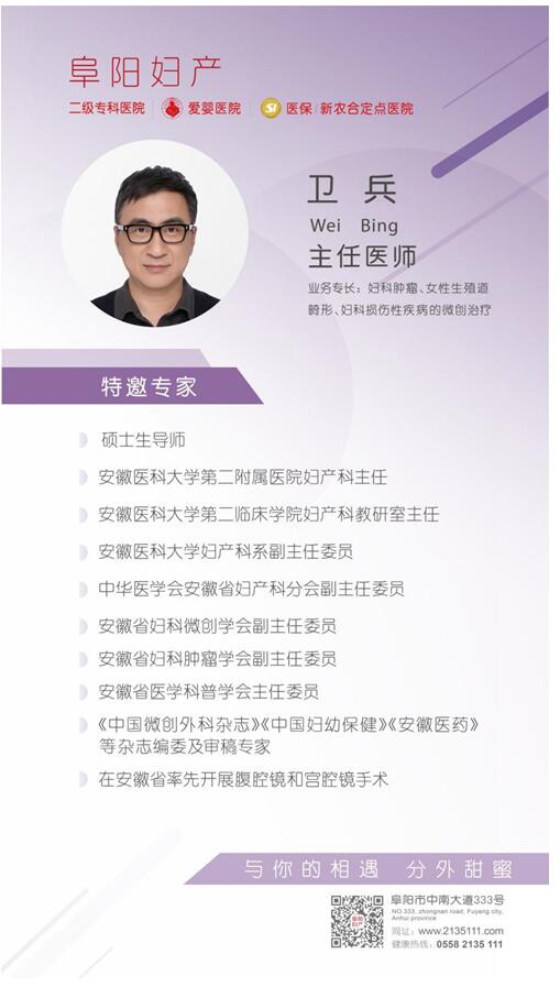 阜阳百佳妇产医院想女性健康之所想,忧女性健康之所忧。为了更好地关爱和呵护阜城女性健康,让更多的阜城女性病患足不出阜阳,省去排队、找熟人挂省著名妇科专家号的麻烦,特邀安医大妇产科主任、安徽省著名妇科微创专家卫兵教授每星期来医院进行亲诊、手术,方便每一个来医院看疑难妇科和妇科肿瘤的女性朋友。