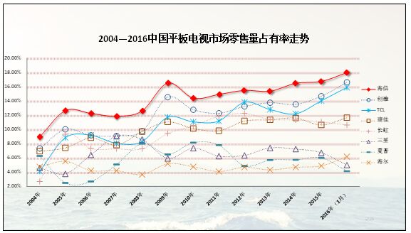 2月22日,权威调研机构中怡康发布了2016年1月份彩电市场数据:海信平板电视以17.98%零售量占有率高居榜首,这是海信从2014年以来连续13年占据中国平板市场第一位。2016年海信电视的强势表现进一步突出,1月份的17.98%是海信电视月度市场份额的最高点,超越了日韩三大品牌(三星、夏普、索尼)市场份额的总和。