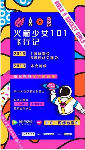 在出道之初,火箭少女101就向外公布了未来两年的发展计划:包括音乐、满足女团创始人的想法和愿望、综艺和商业回报四个方面。在备受期待的音乐方面,计划推出超过20个音乐作品,以及已经在策划的2018-2019年的“飞行演唱会”;而为了感谢女团创始人的支持,也将在两年内办10场以上的粉丝见面会。 “飞行首唱会”以及三场“飞行见面会”就是这个以梦想为名的音乐计划开始的起点。每一站的活动,每一次与粉丝的见面,就是她们的一次开舱接地登陆。在活动中,火箭少女101将与女团创始人们进行亲密接触,分享她们的青春感悟及她们最美好的音乐。作为连接中心,腾讯视频将全程分享她们探索太空的成绩与成长,将讯号传递到世界的每一个角落。 作为火箭少女101飞行之旅首次与地面的连接,《飞行首唱会》将于10月20日在北京电影导演中心举办,11位怀揣梦想的女孩将现场带来《撞》、《Light》等人气歌曲,把新专辑的初舞台回馈给万千粉丝,而从《创造101》出发的她们也将回归初心献上节目主题曲《Pick Me》的表演。为了回馈一路陪伴守护着少女们梦想的粉丝,火箭少女101也将在现场与粉丝亲密互动。作为官方互动平台,腾讯视频星粉互动社区doki也在社区内发起了粉丝招募,抢票活动关注量超过12万,反响热烈。在火箭少女101此后的粉丝活动中,doki也将推出更多新玩法。
