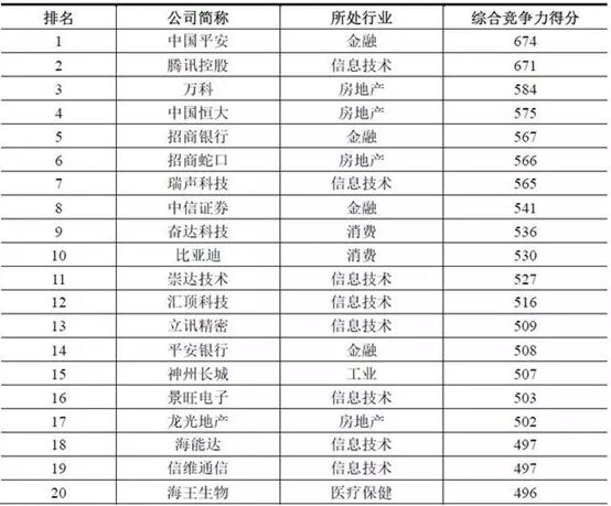 11月27日,中国(深圳)综合开发研究院联合宏信证券共同发布了《深圳上市公司发展报告(2018)》,报告利用三级、27个具体指标从规模实力、发展潜力、经营能力、社会贡献力4个维度对深圳上市公司竞争力进行评价。其中,A股上市的奋达科技(002681.SZ)的综合竞争力和经营能力分别排名第九和第二。 在综合竞争力方面,奋达科技以536分的得分在深圳上市公司综合竞争力榜单上排名第9,排在奋达科技前面的上市企业分别是中国平安、腾讯控股、万科、恒大、招商银行、招商蛇口、瑞声科技、中信证券。 表1:深圳上市公司综合竞争力20强