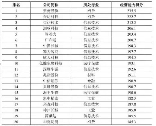 数据来源:CDI上市公司研究数据库 从经营能力单项指标看,奋达科技以222.7的得分排名第二,仅次于索林股份的235.5分。 表2:深圳上市公司经营能力20强
