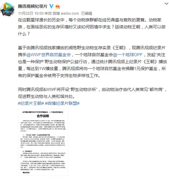 精制、精播双管齐下,令《王朝》备受好评,不少网友表示“希望人们经过这部纪录片能认知到保护野生动物、保护大自然是我们每一个人的义务”。不仅如此,片中拍摄团队为陷入冰窟中的帝企鹅挖掘“救命阶梯”、为中毒的小狮子呼叫救援等人类对野生动物的救助之举,更是一度引发社会探讨。为了唤起大众对野生动物的更多关爱与尊重,在《王朝》播出期间,腾讯视频也特别携手“世界自然基金会”、“一个地球基金会”,发起“关注也是一种保护”的野生动物保护公益行动,让观众在观看纪录片的过程中就能参与野生动物保护,更加深刻理解人与自然和谐共处的意义和价值,而活动所筹到的善款,也将用于支持生物多样性的工作中。