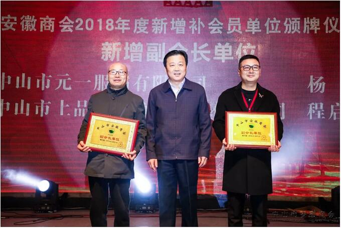 商会领导班子祝酒 安徽省驻广办吴勇副主任为企业家们颁发副会长单位牌匾 2018年,是安徽商会的成果年。晚宴上,为新增副会长、理事、会员颁发了牌匾共计37人,同时商会广大会员为商会的发展作出了积极的贡献,显现出很多先进个人。为了表彰他们对商会的付出,安徽商会授予“突出贡献”颁奖3名、“优秀会员”颁奖10名、“优秀专员”颁奖3名,以及颁发6家“友好合作单位”牌匾、“掼蛋大赛”冠亚季军组合及优胜奖。