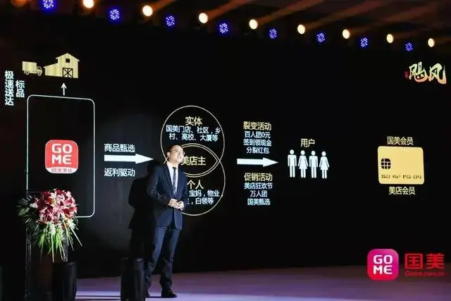 ![]() "黑伍"发布会正式开启 在国美如今的零售体系下,国美APP、国美门店、国美美店三大端口已经有了清晰的定位;国美APP将承担会员经营等功能;国美美店则将承载社交、商务、分享等功能于一体。且国美实体店和国美美店将作为国美低成本流量来源的核心,国美APP是流量汇集和分发的总平台,三端互为引流、互为工具、互为场景,实现线上线下的融合。 国美美店:自购省钱 分享赚钱 发布会上,国美零售副总裁、国美美店总经理汪峰介绍了美店的运作模式。美店作为共享平台,是连接商家和店主的桥梁,为商家提供规模化的销售方案并满足消费者自购省钱、分享赚钱的诉求。美店通过"组团"、"立减"、"超级返"三种核心营销玩法,向消费者提供高品质、低价格的商品;另外,消费者可以轻松切换角色成为卖家,人人都可以分享商品,因分享而获利。在国美美店的运作模式下,所有人可以免费共享国美平台的价值,零成本、零投入成为经营者。如此通过权益驱动购物体验促使用户做出决策,实现消费者快速"种草",增强用户之间的黏性,促成最终交易。