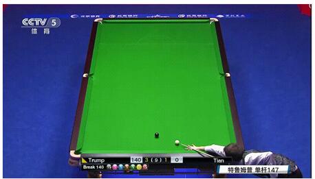 贾德·特鲁姆普在对阵中国选手田鹏飞的比赛中,第五局中打出一杆147满分杆,这是他个人职业生涯的第三杆147满分杆,也是世界斯诺克中国公开赛历史上的第三杆147满分杆。 2018年-奥沙利文、宾汉姆 2018年4月3日,奥沙利文虽然输了比赛,但也表现了火箭般杀伤力,仅仅6分54秒就打出了147分