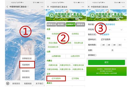 1. 关注“中国绿色碳汇基金会”公众号来认养树木(操作方式如图)注:点击“我要捐赠”-“低碳植树”-选择“辽宁沈阳市”-填写信息-提交并微信支付,即可支持到本次活动。
