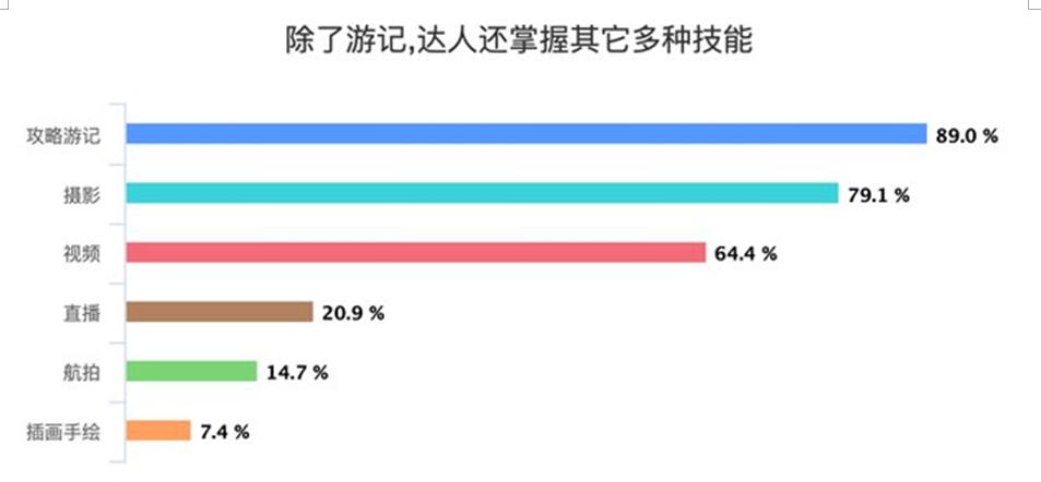 在旅行达人的地域分布上,上海、北京、杭州成为了旅行达人最集中的前三城市,分别占比分别以13%、11%、9%。 这些旅行达人的足迹遍布全世界,从南极、北极,到墨西哥、阿根廷、南非、撒哈拉,有人类居住的地方都有旅行达人的身影。他们平均每月旅行的次数是2次以上。数据显示,90%的达人至少去过10个以上国家,而去过的城市这一平均数量是82个。“打卡”七大洲,已被很多达人放在“已完成”一栏。 超两成达人全职旅行 能拍会写是标配 是不是只要喜欢旅行,就可以成为旅行达人?答案并非如此。报告显示,几乎每个旅行达人都有一技之长。 旅行达人在职业标签上呈现出极高的重合度。比例上,占比最高的职业分别为摄影师13%、职业旅行者11%、自由职业9%及媒体记者4%。 要想边玩边赚钱,并不简单。报告显示,旅行达人要撑起自己的“品牌”,能写会拍有创意是基本的技能点,还要有超强的个人魅力、社交、生活圈意见领袖身份,资源调度、语言能力等综合素质。过硬的综合实力才能在激烈的竞争中成为头部玩家。报告显示,有89%的旅行达人都擅长写攻略游记,79.1%的达人都具备摄影技能。