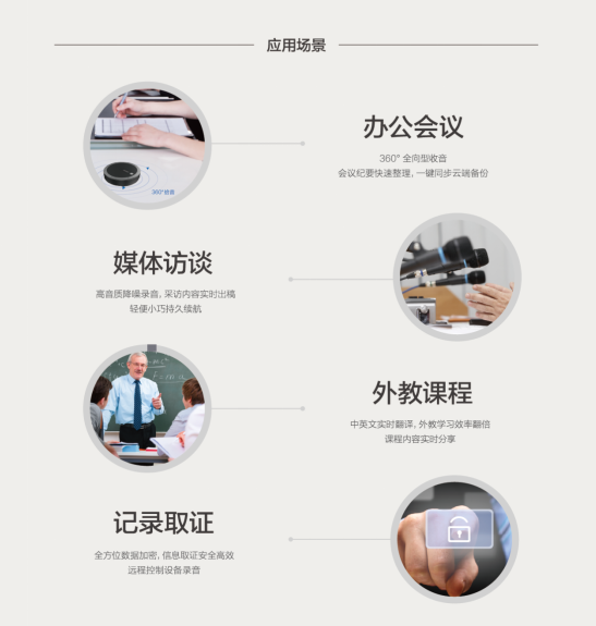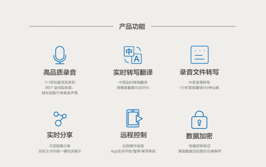 在这个基础之上,全新升级的M1还增加了以下三大新功能: 1/实时转写翻译,解决沟通痛点 升级版M1的中英文实时转写翻译,准确率高达95%。 这也是基于科大讯飞强大的语音转写能力为基础,不仅能够实现实时的语音转写文字,同时还可以实现英文翻译,结果准确率高达95%,即便是参加跨国会议也没有任何问题。 并且,一场会议结束后,你可以通过App或者网站上传会议录音,实现整场会议的文字转写。一般来说,一场1小时左右的会议,音频转文字结果最快5分钟就可以出稿,非常地高效,也因此它也成为很多记者和文字工作者的职场必备工具。 2/异地文字直播,一键扫码可见可分享 可实现会议现场文字直播,只要分享二维码,即便身处异地也能即时可见,实时参与。 你可以在会议开始时即时生成二维码,同时把这个二维码分享出去,所有与会的成员就都能看到实时的语音转写结果,准确率高达95%。 也就是说,你能边听边记录边看,在看到具体信息的时候,有什么异议就做出及时的反馈,这样一来,就完全避免了信息误差。 3/远程控制录音,信息随时随地可记录 远程操作设备,App支持开始/暂停/保存录音。 有时候你参加一场大会直播,可无奈被前面乌泱泱的人群堵着,眼看会议就要开始了,距离太远急着录音满头大汗,简直头大崩溃,怎样不出错地及时参与并做好记录?最新升级版的M1就可以搞定。 你可以下载“讯飞听见”在手机App上实现远程控制,把硬件机器留在最前沿,人在远处可以通过手机App一键开启录音,M1的7+1环形麦克风阵列能实现10米内的降噪拾音,会帮你准确记录与会者的全程发言,保证信息不遗漏。 在结束会议时,你可以一键关闭操作,录音会自动保存在你的App上。并且,录音还会备份到云端,也可加密处理,最大程度保护了你的会议信息。
