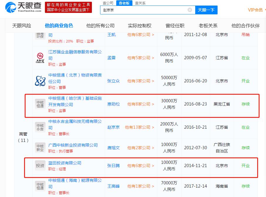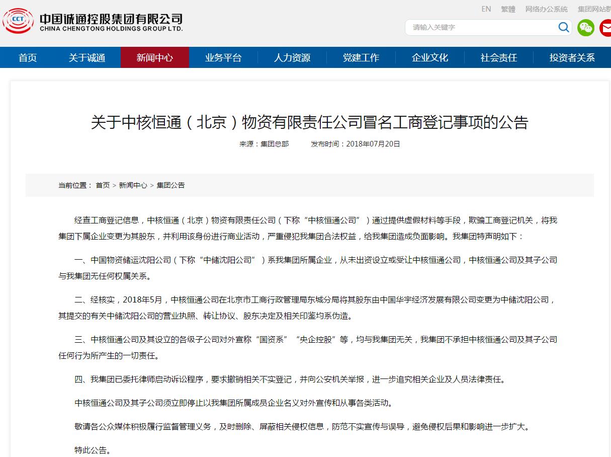 赵京京的任职情况。数据来源:天眼查 但是中核恒通自身的身份却备受质疑。央企中国诚通控股集团(下称诚通集团)2018年7月20日发布《关于中核恒通(北京)物资有限责任公司冒名工商登记事项的公告》。公告称,经查工商登记信息,中核恒通(北京)物资有限责任公司通过提供虚假材料等手段,欺骗工商登记机关,将诚通集团下属“中国物资储运沈阳公司”变更为其股东,并利用该身份进行商业活动,严重侵犯诚通集团合法权益,给诚通集团造成负面影响。