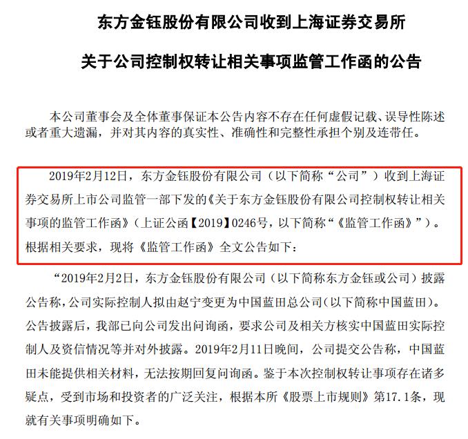 东方金钰股份有限公司(东方金钰,600086)“易主”中国蓝田总公司(下称中国蓝田)不止受到市场关注,还收到了上海证券交易所监管工作函。 2月12日晚间,东方金钰公告上交所监管工作函全文。上交所表示,鉴于本次控制权转让事项受到市场和投资者的高度关注,涉及诸多疑点,东方金钰实际控制人赵宁及拟受让方中国蓝田在全面核实并充分披露相关事项前,应当审慎考虑是否继续推进本次交易,稳定市场预期,切实维护公司和中小投资者利益。